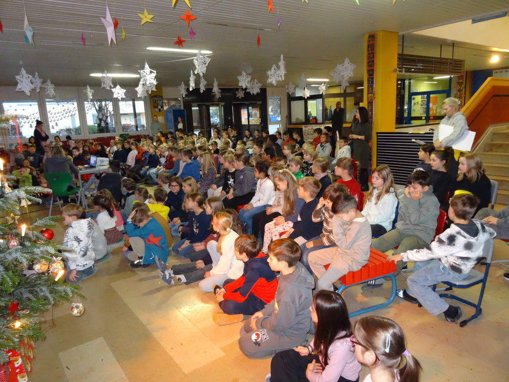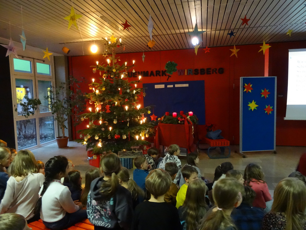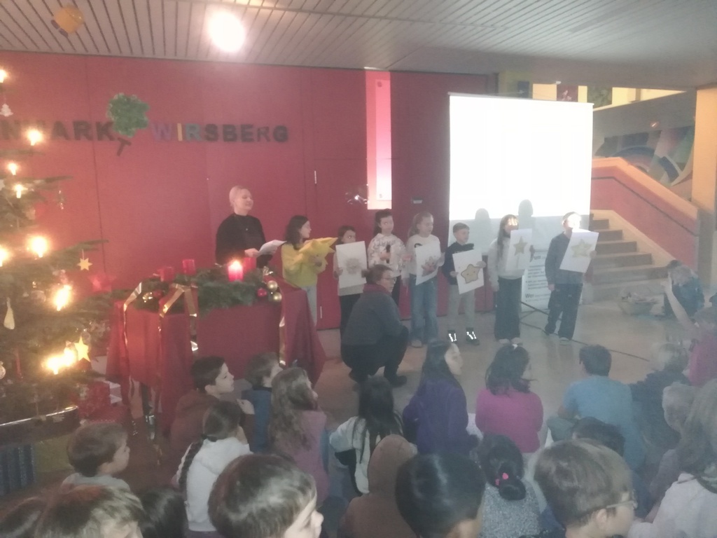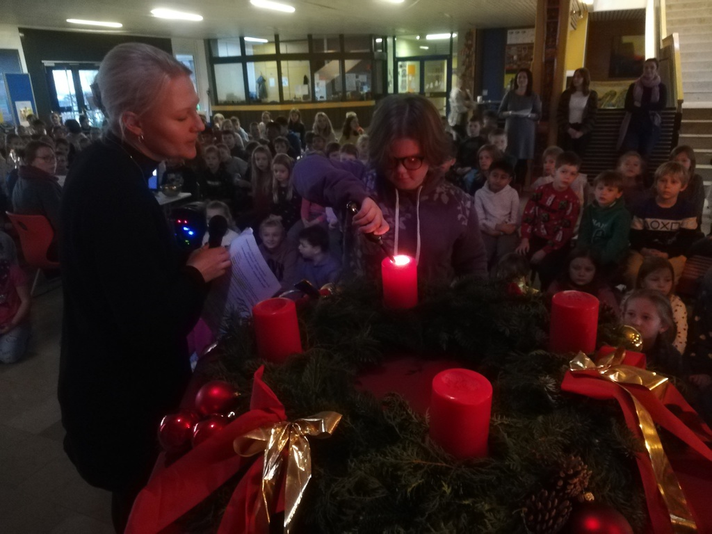Am 01.12. fand die erste Adventsandacht der Grundschule statt. Unter der Leitung von Carina Reichel und Sonja Frederking verbrachten die Kinder unter dem Motto "Sternenzeit" eine besinnliche Viertelstunde in der Aula und entzündeten dabei auch die erste Kerze des Adventskranzes.