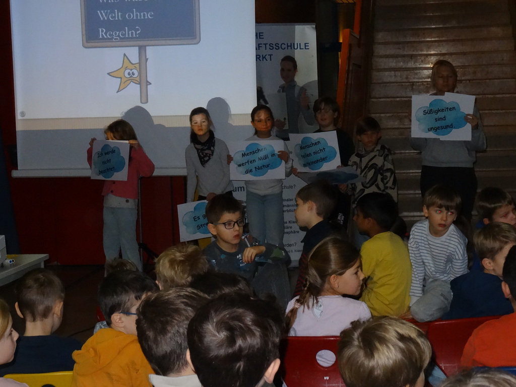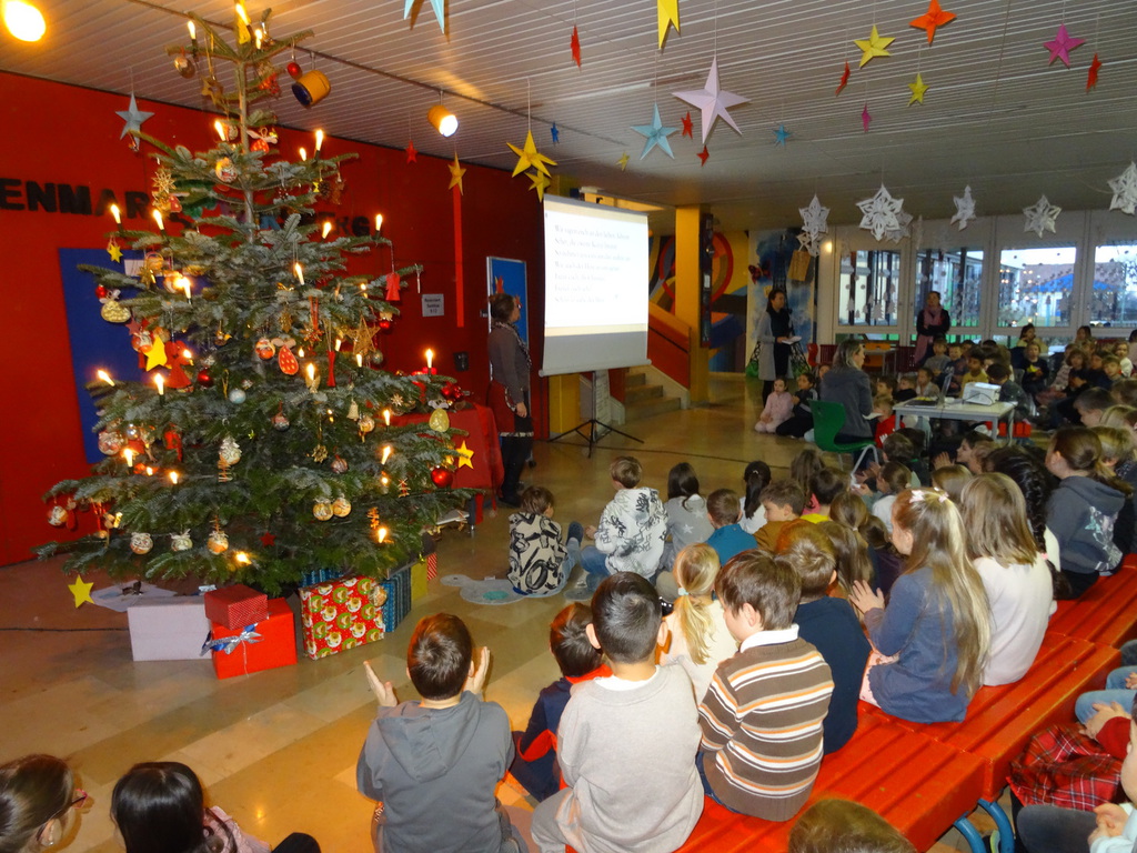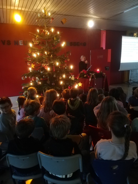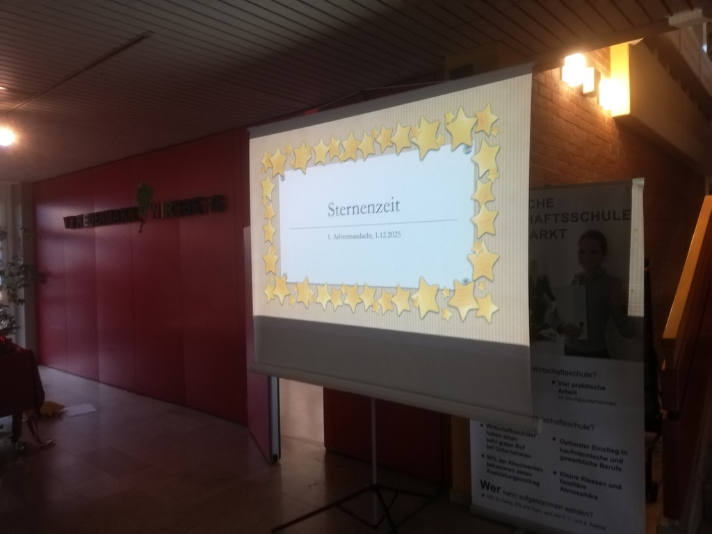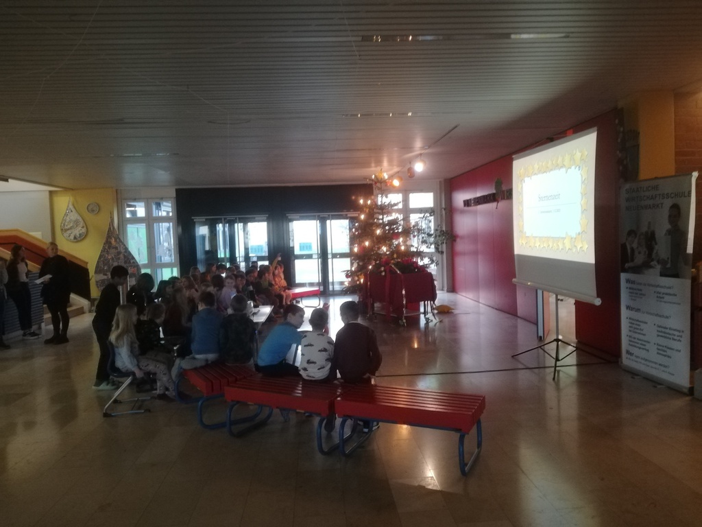 Am 01.12. fand die erste Adventsandacht der Grundschule statt. Unter der Leitung von Carina Reichel und Sonja Frederking verbrachten die Kinder unter dem Motto "Sternenzeit" eine besinnliche Viertelstunde in der Aula und entzündeten dabei auch die erste Kerze des Adventskranzes.