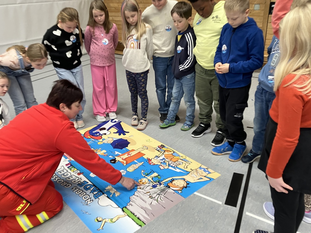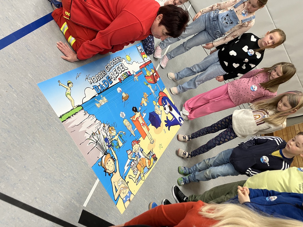 In einem zweistündigen Programm wurden die Kinder spielerisch über sicherheitsbewusstes Verhalten aufgeklärt und mit den wichtigsten Baderegeln vertraut gemacht. Mit Bildern, Rettungsring, Rettungswurfball und der „schwimmenden Rettungsschlaufe“ sowie mit einem Baderegeln-Puzzle wurde den Kindern veranschaulicht, worauf man bei Baden Acht geben muss, wie z.B.: