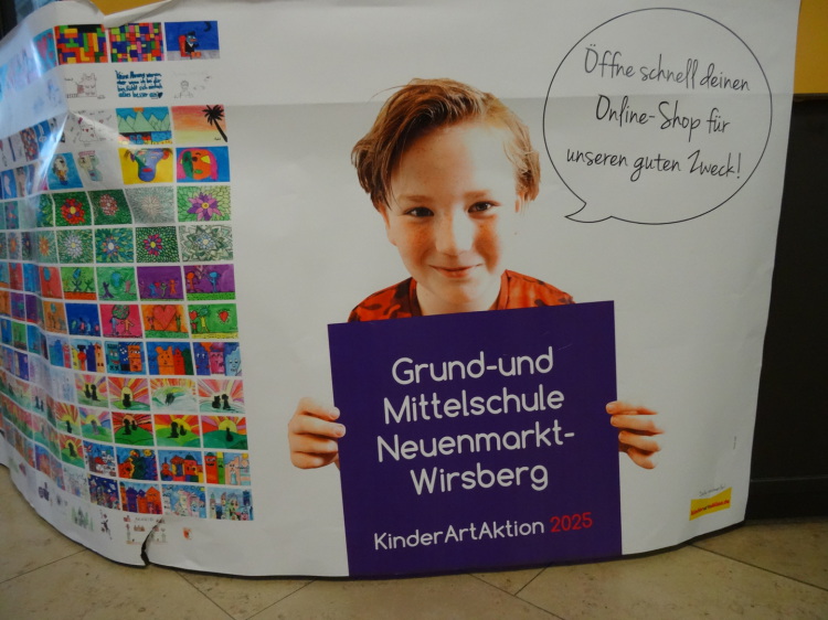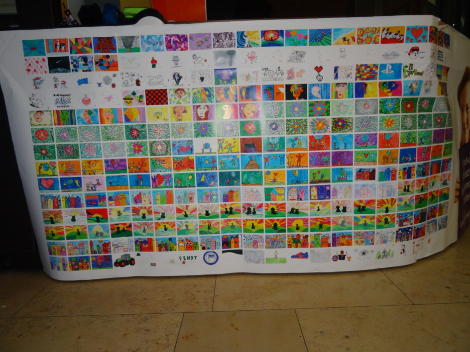Momentan ziert ein großes Plakat unsere Aula. Darauf zu sehen sind alle Kunstwerke, die unsere Schüler im Rahmen der KinderArt-Aktion gestaltet haben.