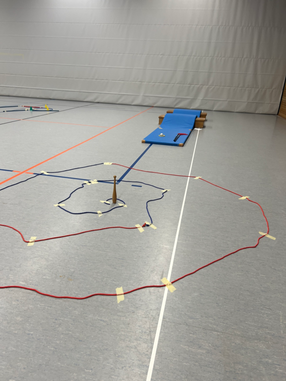 Mit Turnmatten, Bänken, Kästen, Reifen, Seilen und Slalomstangen entstanden fantasievolle Bahnen mit unterschiedlichen Schwierigkeitsgraden.